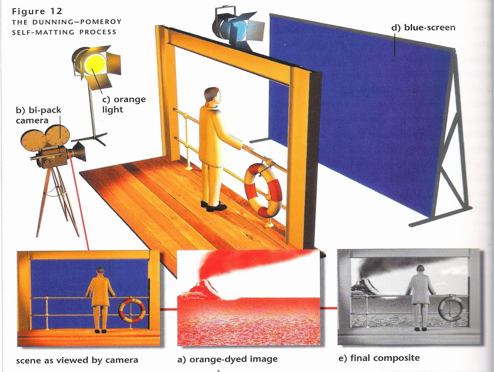 Parmi les techniques de matting, le procédé Dunning-Pemoroy utilisé dans King Kong en 1933 était un procédé unique et minutieux. Le fond est photographié, et ses négatifs sont teints en orange et utilisés dans un processus d'impression positive. L'impression orange du fond est placé devant un négatif vierge et le premier plan est filmé en studio. Il est éclairé par une lumière orange et filmé sur fond bleu. Le résultat donne une superposition mais n'est pas parfait.