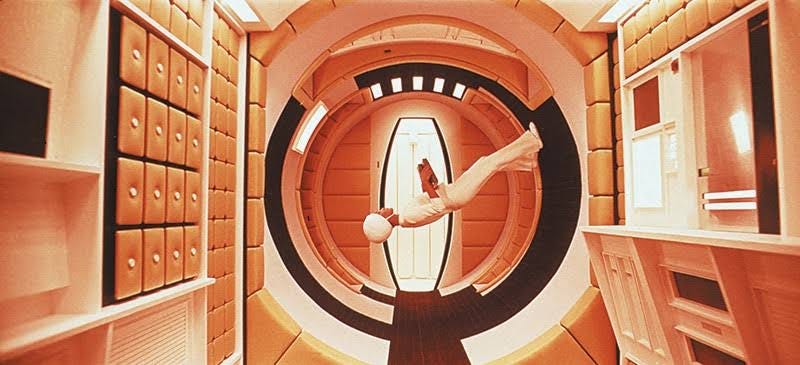 - La rotation du set : Un effet réutilisé encore et encore par la suite, dans Poltergeist, Inception, Royal Wedding, est le plateau tournant. La caméra est placée fixe dans l'environnement qui tourne. Les objets sont tous factices et fixés dans la scène, mais l'acteur lui se retrouve tantôt au sol, tantôt sur les murs ou au plafond. 2001 est le premier à inventer cet effet très couteux, et les spectateurs de l'époque sont médusés.